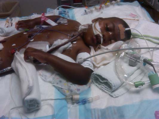 So to try and get an idea of the condition of his brain the doctors decided to take him off of sedation to see what type of activity he does on his own. You have to look at the video footage. Now, to show you how I knew my little man was back. Whenever they get ready to take out the breathing tube, they always wait until he’s alert enough to pick up breathing on his own. So prior to that time he’s, of course, in a fuss as you can imagine and tries going for that tube to take it out.