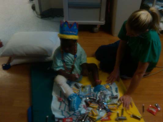 The Head of the Cardiovascular-Thoracic Surgery Department, Dr. Backer and his family personally bought Qadar the Caterpillar Birthday Cake that’s also in the picture. Many of his surgeons, doctors’, nurses, and other support staff came to his room to offer their birthday greetings and give him gifts. The 5th Floor Family Life Center staff made the green poster board with the lion on it. They walked around and so many of the medical and support staff on the 5th Floor signed it and presented to him for his birthday. This little fighter attracts love and attention wherever he goes.