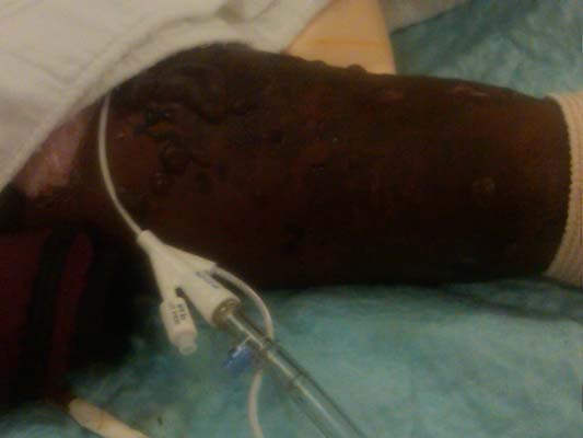 His leg is still full of blisters but the swelling has come down since his fasciotomies.
